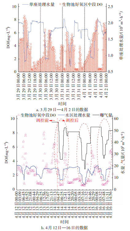鼓风机调控前,由于风量调节难以适应水量变化,导致低水量期气量与能源浪费,而高水量期则气量供应不足。生物池处理水量、曝气量与DO变化情况见图3。