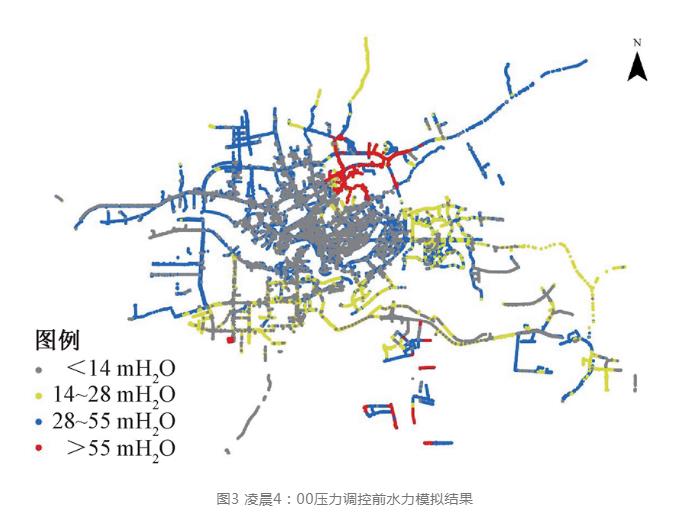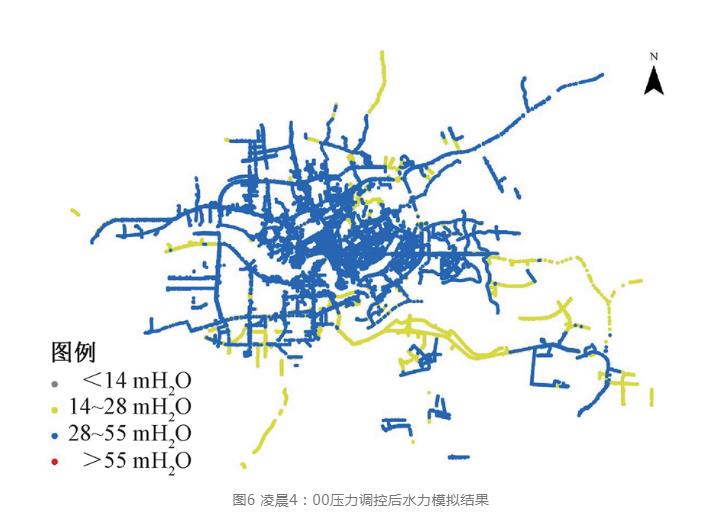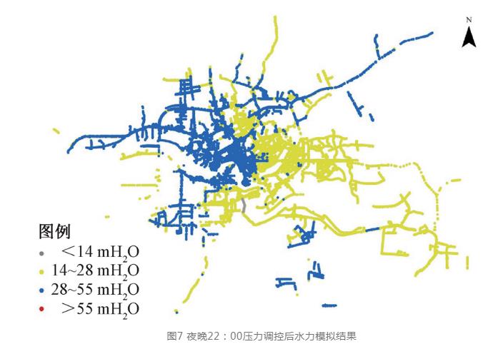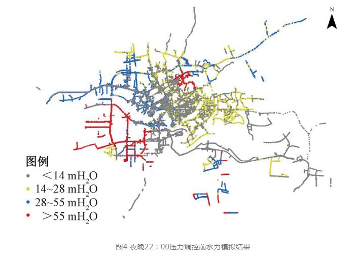 图6及图7为最高压时段以及最低压时段即凌晨4:00以及夜晚22:00压力调控后水利模拟结果图。由图可知。凌晨4:00经过压力调控后,压力小于14mH2O的压力点均提升到了14mH2O以上,55mH2O以上的高压区域全部调整到了55mH2O以下,14~28mH2O的压力点占少数,28~55mH2O的压力点占大多数。夜晚22:00经过压力调控后,压力小于14mH2O的压力点均提升到了14mH2O以上,55mH2O以上的高压区域全部调整到了55mH2O以下,14~28mH2O的压力点与28~55mH2O的压力点各占一半。