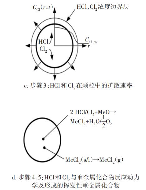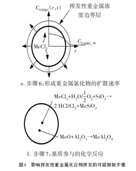 图2显示了挥发性重金属化合物在整个挥发过程中可能存在的限制步骤。每种重金属的限制步骤不尽相同,其中,步骤6与步骤7相互竞争,重金属氯化物可能在反应后开始挥发,也可能与反应体系内的基质进行二次反应。
