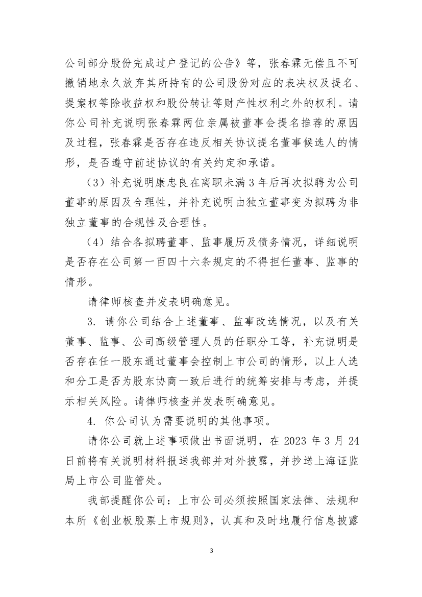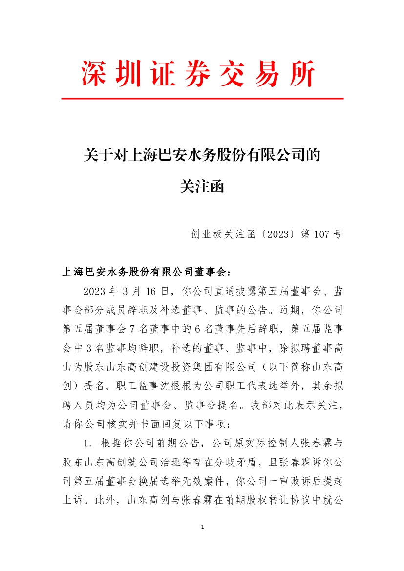 3月20日,深交所向巴安水务发出关注函,要求说明董事、监事集中辞职的原因及合理性,是否存在应披露未披露的事项等,并提示相关风险。关注函称:“近期,你公司第五届董事会 7 名董事中的 6 名董事先后辞职,第五届监事会中 3 名监事均辞职,补选的董事、监事中,除拟聘董事高山为股东山东高创建设投资集团有限公司提名、职工监事沈根根为公司职工代表选举外,其余拟聘人员均为公司董事会、监事会提名。”
