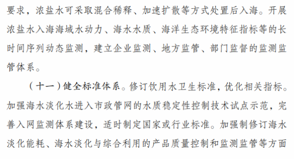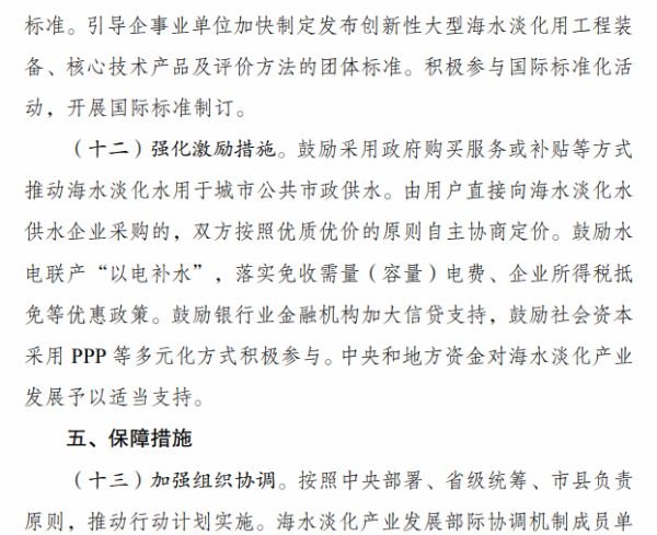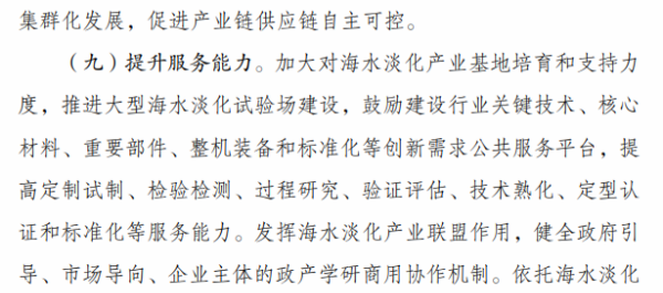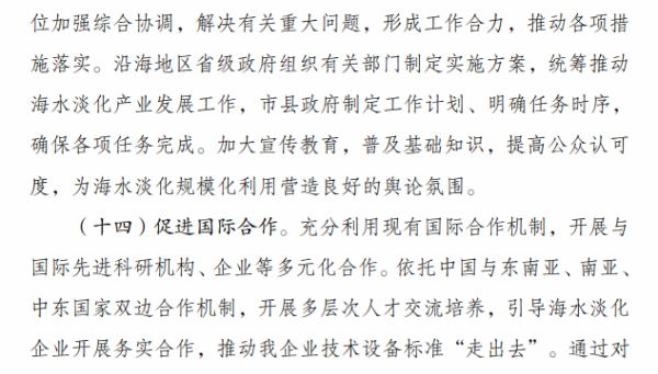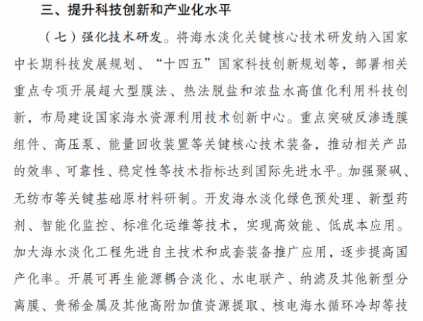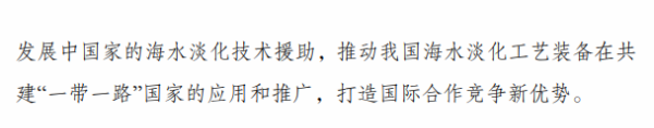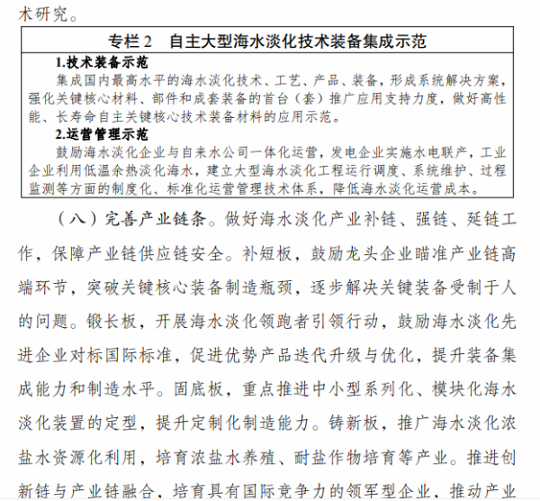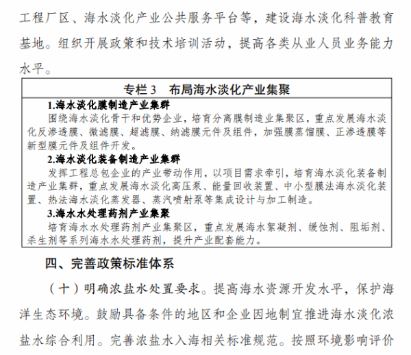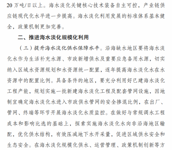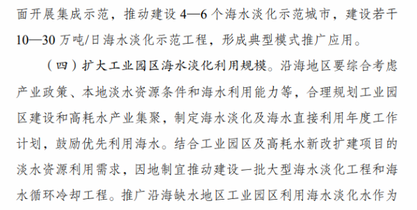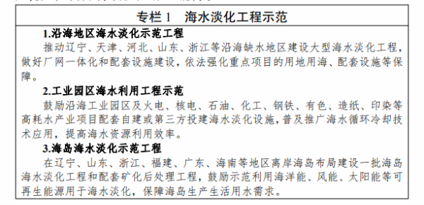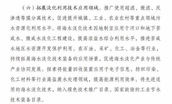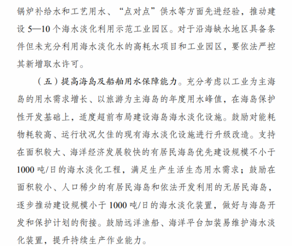 《行动计划》提出,“十四五”时期要着力推进海水淡化规模化利用。一是提升海水淡化供水保障水平。沿海缺水地区要将海水淡化水作为生活补充水源、市政新增供水及重要应急备用水源,逐年提高海水淡化水在水资源中的配置比例,建设海水淡化示范城市和示范工程。二是扩大工业园区海水淡化利用规模。鼓励沿海地区工业园区和高耗水产业优先利用海水,建设海水淡化利用示范工业园区。三是提高海岛及船舶用水保障能力。在海岛保护性开发基础上,适度超前布局建设海岛海水淡化设施,鼓励远洋渔船、海洋平台加装易维护海水淡化装置。四是拓展淡化利用技术应用领域。推广使用膜分离、能量回收等海水淡化技术,促进浓盐废水处理利用和污水资源化利用、苦咸水综合利用等。