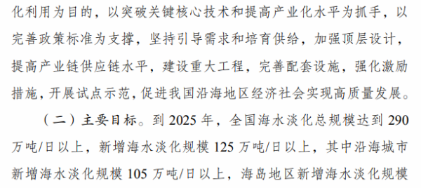 《行动计划》明确,到2025年,全国海水淡化总规模达到290万吨/日以上,新增海水淡化规模125万吨/日以上,其中沿海城市新增105万吨/日以上,海岛地区新增20万吨/日以上。海水淡化关键核心技术装备自主可控,产业链供应链现代化水平进一步提高。海水淡化利用的标准体系基本健全,政策机制更加完善。