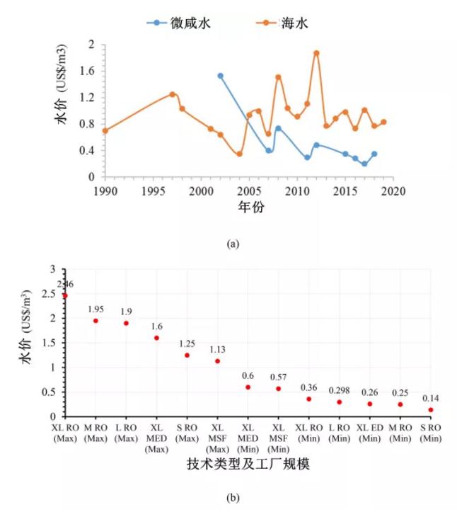 (a)所示的海水和苦咸水淡化的平均成本趋势