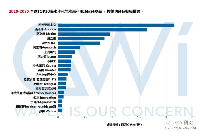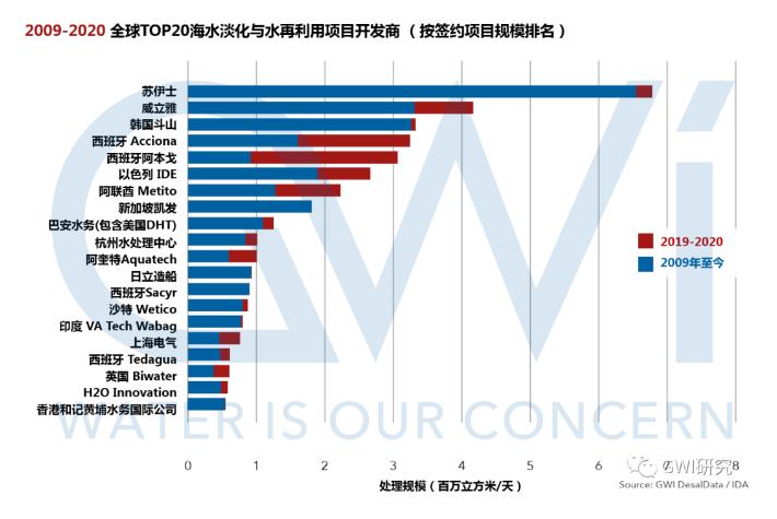 在GWI今年与IDA联合出版的全球脱盐年鉴中,我们分别统计了2009年至2020这十年间以及2019年7月至2020年7月这最近一年间全球海水淡化及水再利用项目开发商的表现情况。调查中我们发现,一些大规模的世界级海水淡化厂推动了整体市场的增长。西班牙阿本戈公司依然表现优异,而新加坡凯发则因为债务困难在过去一年中近乎处于停滞状态。