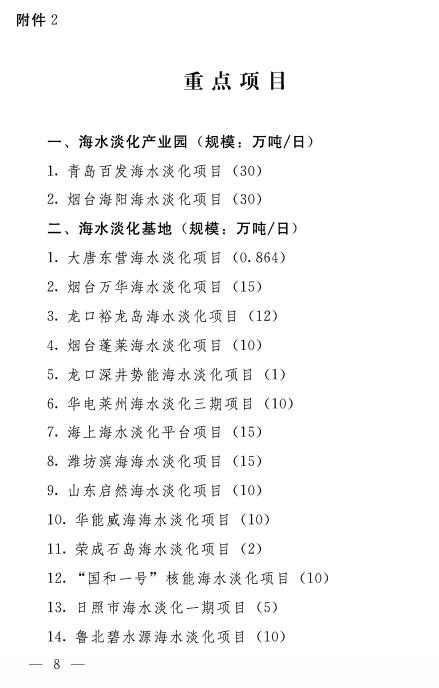 多点。在东营、烟台、潍坊、威海、日照、滨州6市沿海工业园区配套建设14个海水淡化基地,在潍坊市建设2个海水淡化与综合利用基地,实现水盐联产。