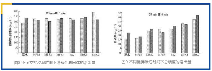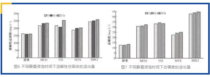 对比表7、图8、图9中试验数据可知,各种元素溶出量较低且差别不大;矿物质总量指标总硬度、溶解性总固体等除扇贝壳外基本与原水差别不大;几种矿化材料在该条件下均无偏硅酸溶出;沸石和扇贝壳有有益元素锶元素溶出,含量约为0.05~0.07 mg/L。主要原因是搅拌时间较短且pH接近中性,矿物质很难溶出,矿化效果不明显。