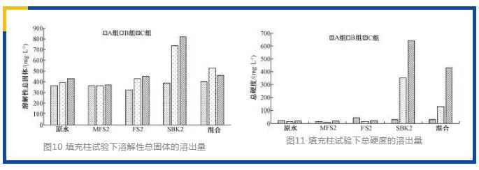 对比表4、图10、图11中A、B两组试验可知,pH对扇贝壳的矿化效果影响较大,不添加二氧化碳调节pH时,几乎无矿物质溶出(A组),加入二氧化碳调节pH值为4.3后,矿物质溶出量明显增多(B组)。对比B、C两组试验数据可知,水在填充柱中的流量对扇贝壳的矿化效果有影响,流量小,矿物质溶出量更大,原因是流量变小,流速变慢,水力停留时间增长,矿化材料的浸泡时间相应增大,矿物质溶出量增多。因此,降低pH并增大水力停留时间,有利于矿物质溶出。