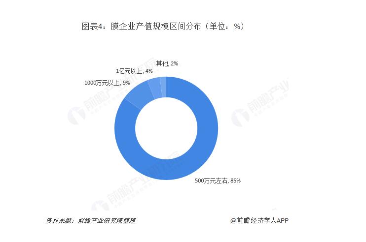 最后,企业规模普遍小。目前,全国从事分离膜研究的院所、大学超过100家,膜制品生产企业300余家,工程公司近1000家。其中,年产值在500万元左右的中小企业约占膜企业总数的85%,年产值1000万元以上的厂家约占8%-10%,年亿元产值以上的企业只占4%(其中大部分有外资投入的背景)。