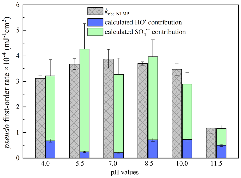 然而,目前经济高效的有机膦酸盐去除技术还较为欠缺。中国科学院测量与地球物理研究所环境与灾害监测评估湖北省重点实验室副研究员王智联合加州大学河滨分校副教授Haizhou Liu团队研究了紫外光/过硫酸盐氧化体系对一种典型有机膦酸盐(Nitrilotris-methylenephosphonic acid, NTMP)的降解过程与机制。结果表明,紫外光/过硫酸盐能有效地降解NTMP,反应遵循伪一级动力学。中性条件有利于NTMP降解,在高碱性条件下(如pH值11.5)降解受到明显抑制,这主要是由于硫酸盐自由基SO4`-浓度降低所致。利用化学探针精密测量技术,首次定量了反应体系中两种主要自由基SO4`-和HO`与NTMP反应的二级动力常数分别为(2.9 ± 0.6) × 107 M-1s-1和(1.1 ± 0.1) × 108 M-1s-1。SO4`-对NTMP降解起主要作用(62%-95%),在pH 4 ~ 11.5之间,SO4`-的稳态浓度比HO` 高11-54倍。在实际含有机膦酸盐的废水中,氯化物和碳酸氢盐的存在会显著影响NTMP的降解速率。通过降解产物的测定,研究人员确定了NTMP的降解路径。经济性比较表明,紫外光/过硫酸盐氧化体系降解NTMP的费用仅为紫外光/双氧水降解体系的5%-45%。该研究表明,紫外/过硫酸盐氧化法是一种经济高效的有机膦酸盐类污染物去除技术,可用于类似废水的深度处理与回用,在当前水生态环境保护与水资源回用中发挥重要作用。