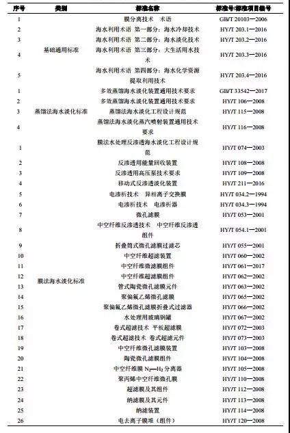 随着我国海水淡化产业的发展,海水淡化行业标准化工作也得到了国家有关部门的重视。继2006年,国家标准委、国家海洋局等部门联合发布了《海水利用标准发展计划》,将海水淡化标准作为重要内容列入《标准化“十一五”发展规划纲要》之后, 2012年,科技部和发展改革委发布的《海水淡化科技发展“十二五”专项规划》中明确指出要发展海水淡化标准战略,提高产业发展的整体性和科学性;2016年,国家发展改革委、国家海洋局联合印发的《全国海水利用“十三五”规划》中明确提出的目标中包括:“十三五”末,海水淡化标准体系进一步健全,政策与机制更加完善,国际竞争力显著提升。通过上述一系列标准计划和国家政策的实施,使我国海水淡化标准体系基本构建起来。